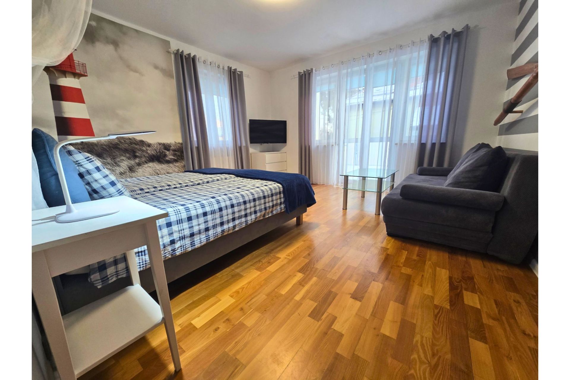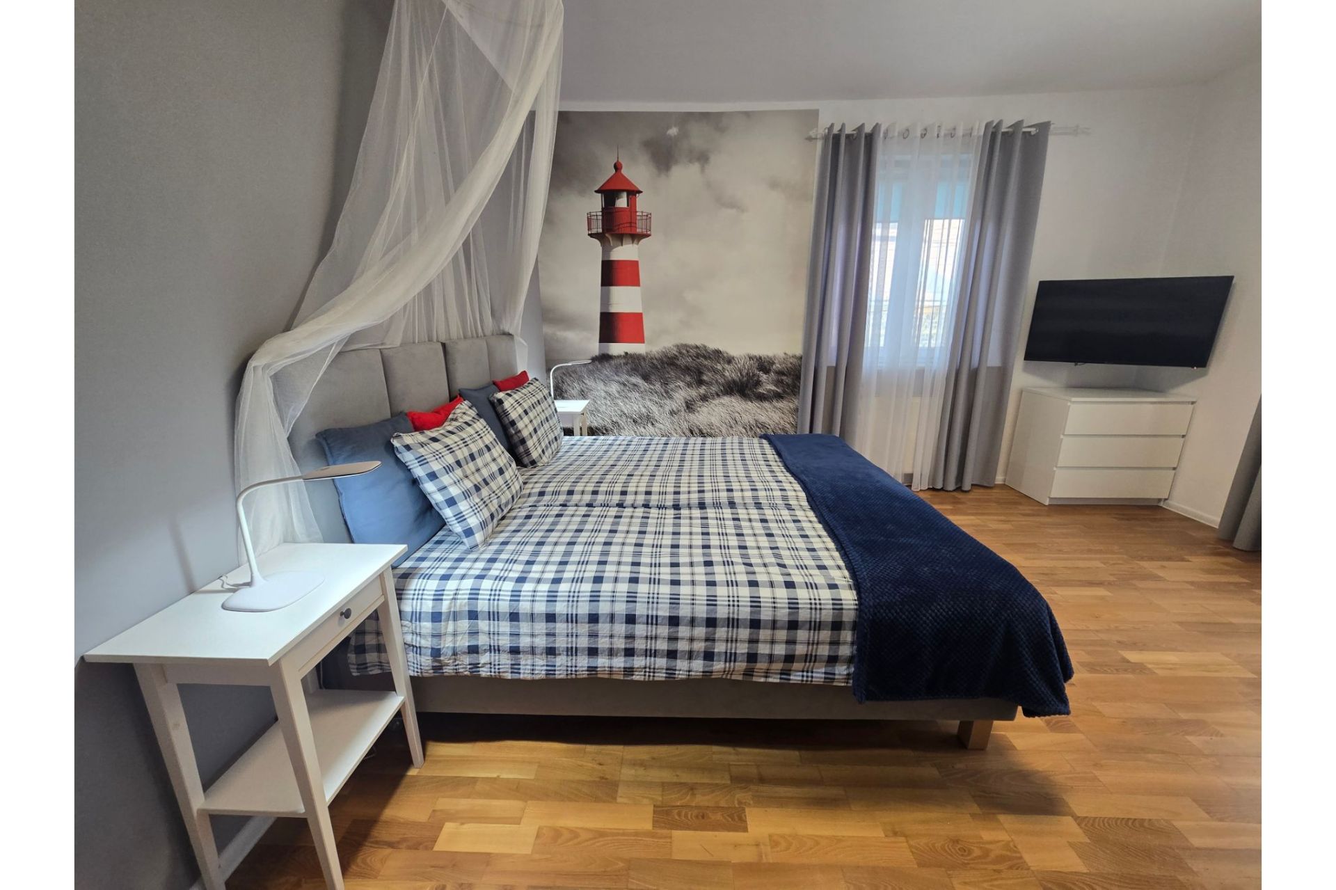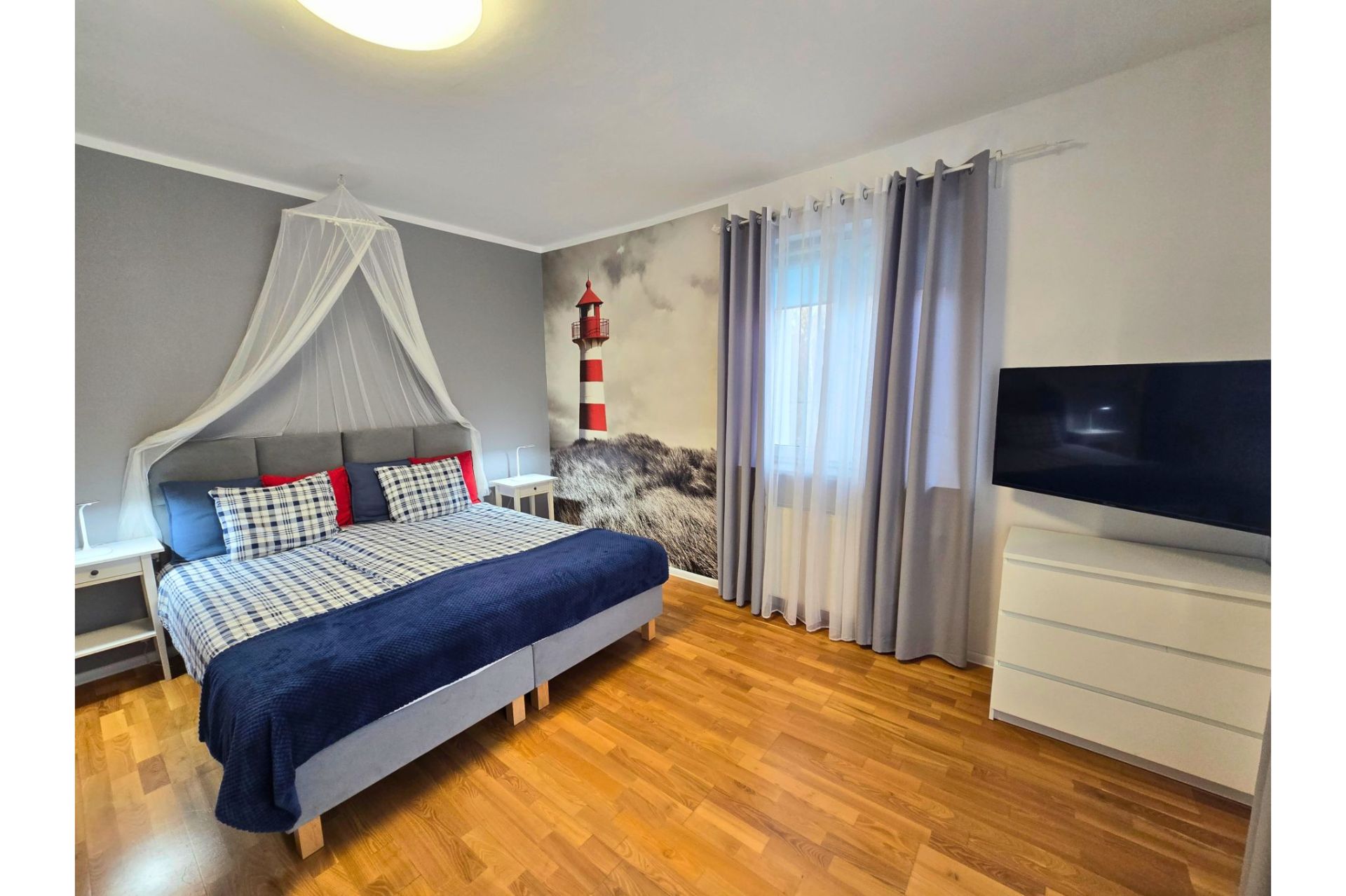 Komfort dwóch sypialni: Apartament oferuje dwie oddzielne, luksusowo wykończone sypialnie w stylistyce marynistycznej. Jedna z nich posiada łóżko z baldachimem oraz charakterystyczną fototapetę z latarnią morską.