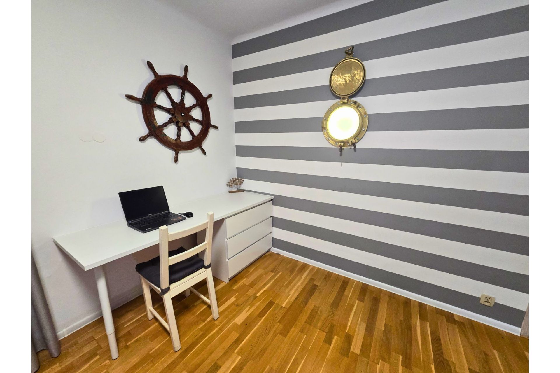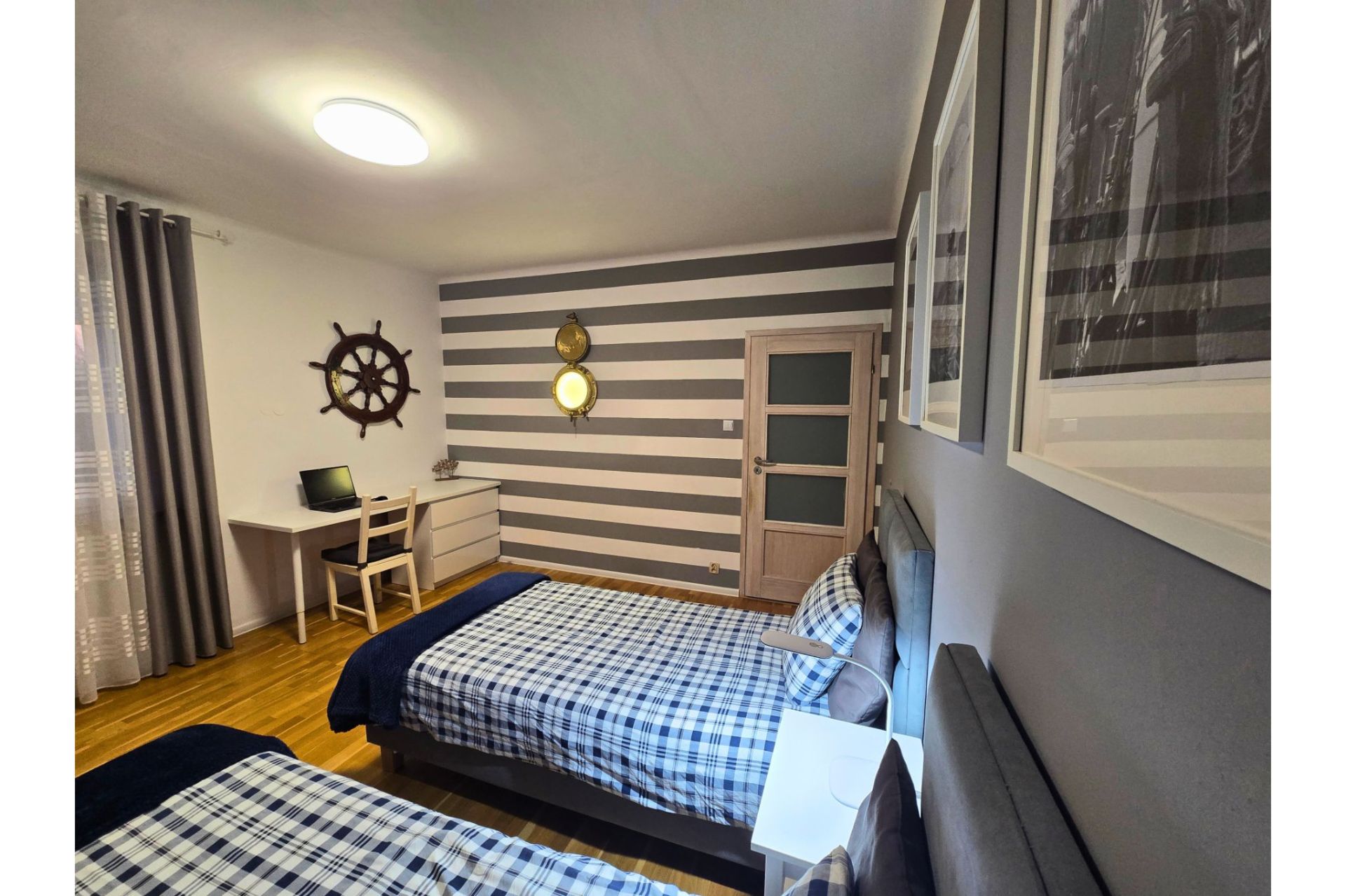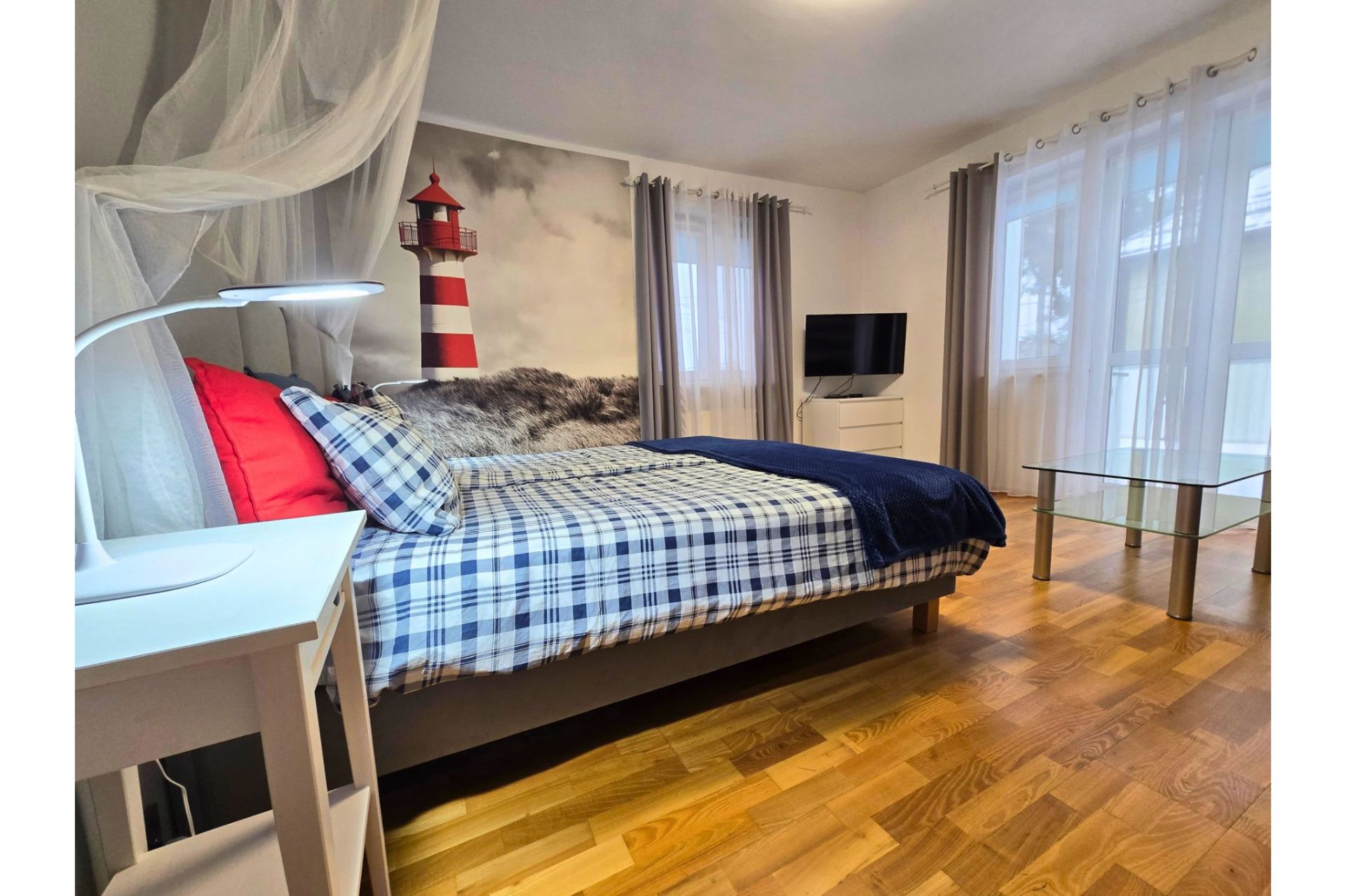 Komfort dwóch sypialni: Apartament oferuje dwie oddzielne, luksusowo wykończone sypialnie w stylistyce marynistycznej. Jedna z nich posiada łóżko z baldachimem oraz charakterystyczną fototapetę z latarnią morską.