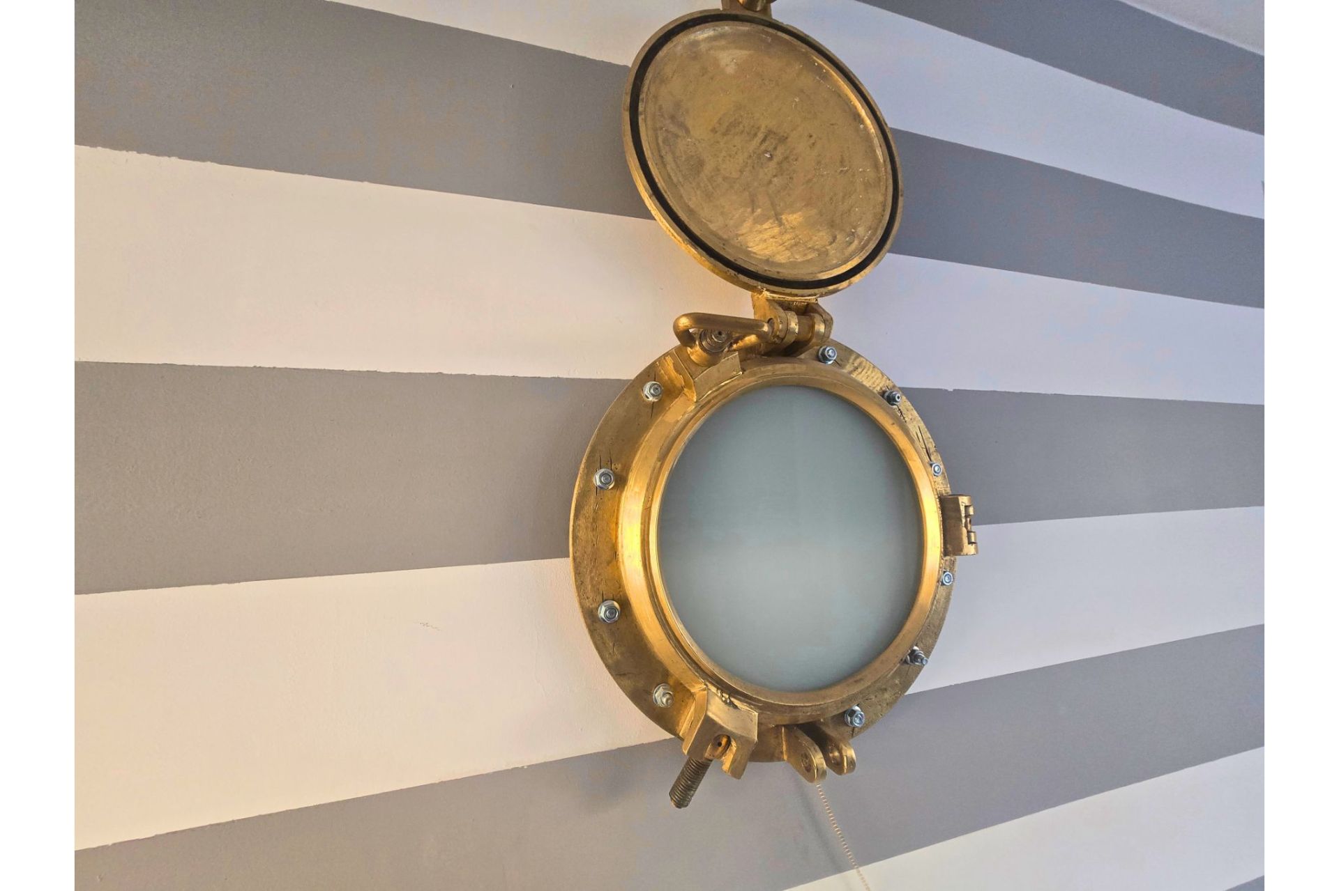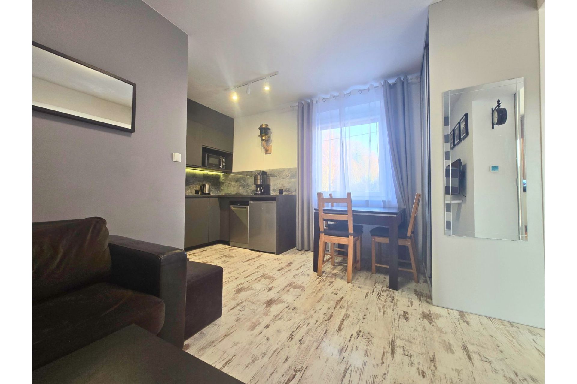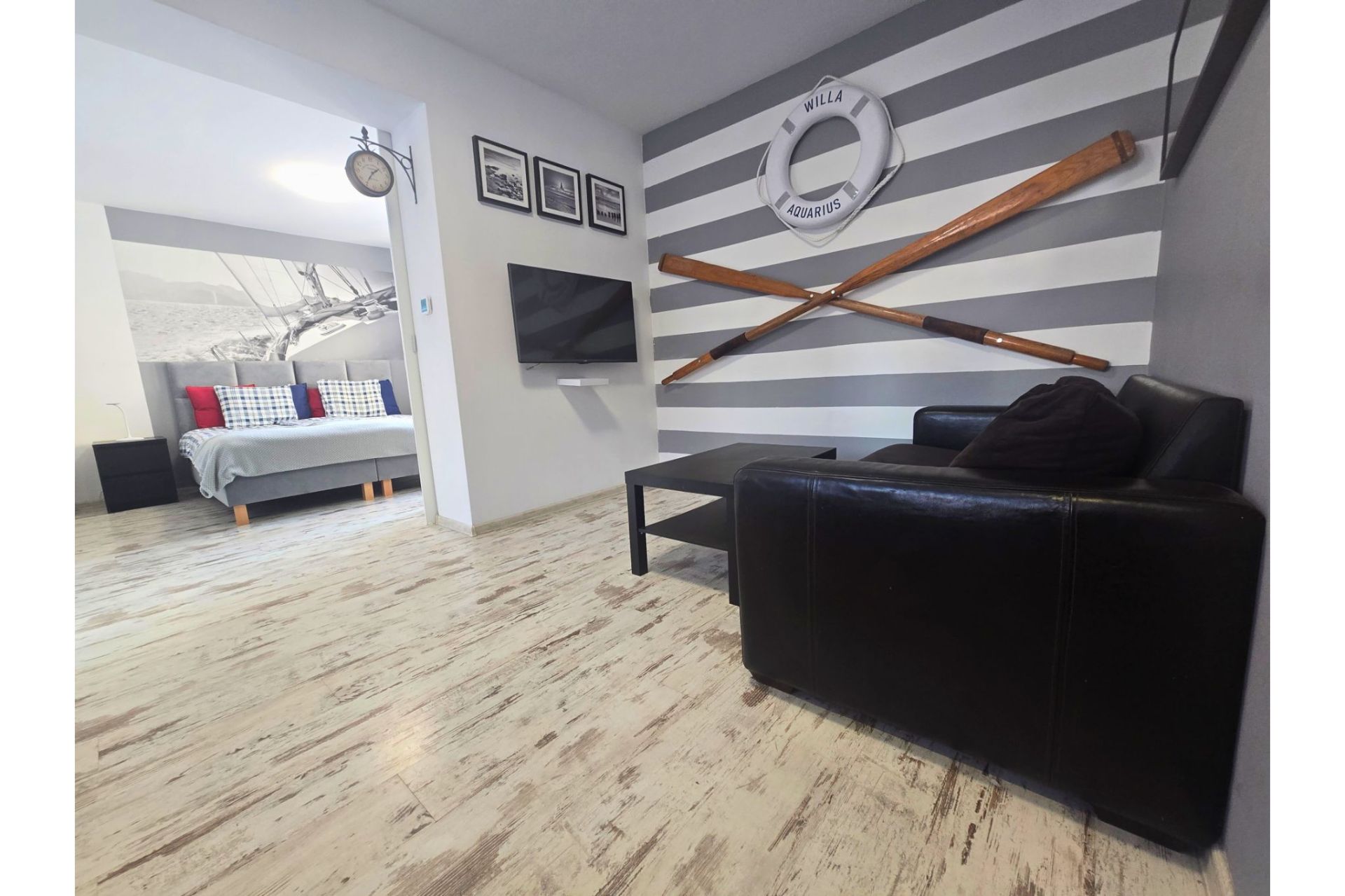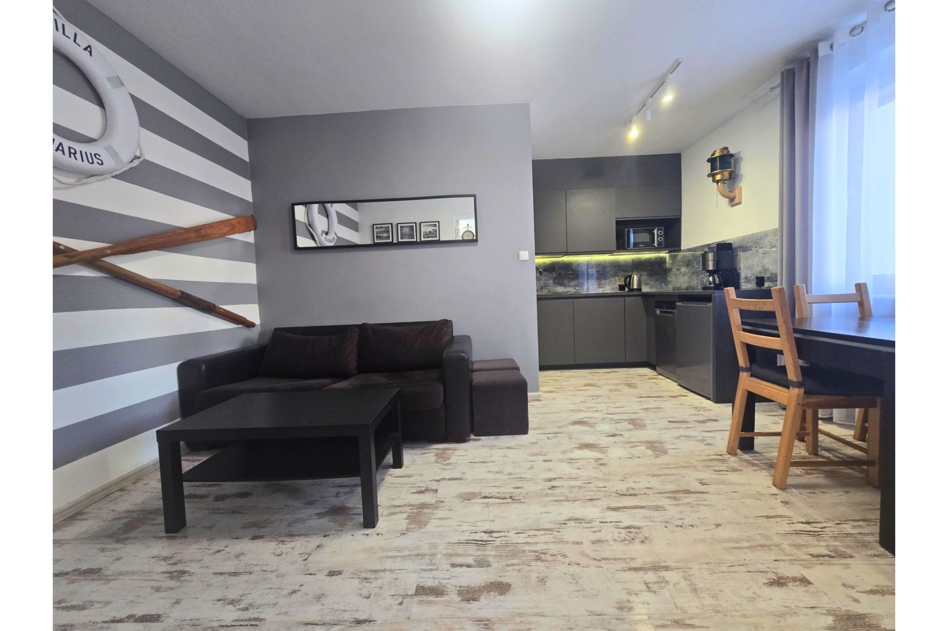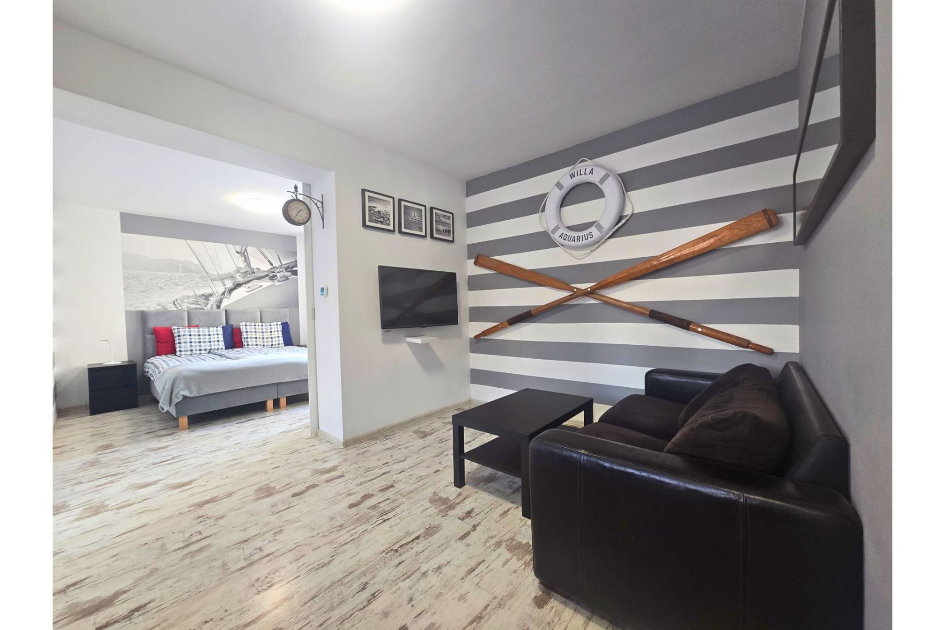 Apartament Marina to wyjątkowe miejsce stworzone dla pasjonatów morza i dobrego designu. Wnętrze wyróżnia się unikalnymi rozwiązaniami, takimi jak stylowe drzwi typu "barn door" z autentycznym bulajem oraz efektowna fototapeta z motywem luksusowego jachtu, które pozwalają poczuć się jak na pokładzie statku – bez wychodzenia z domu.